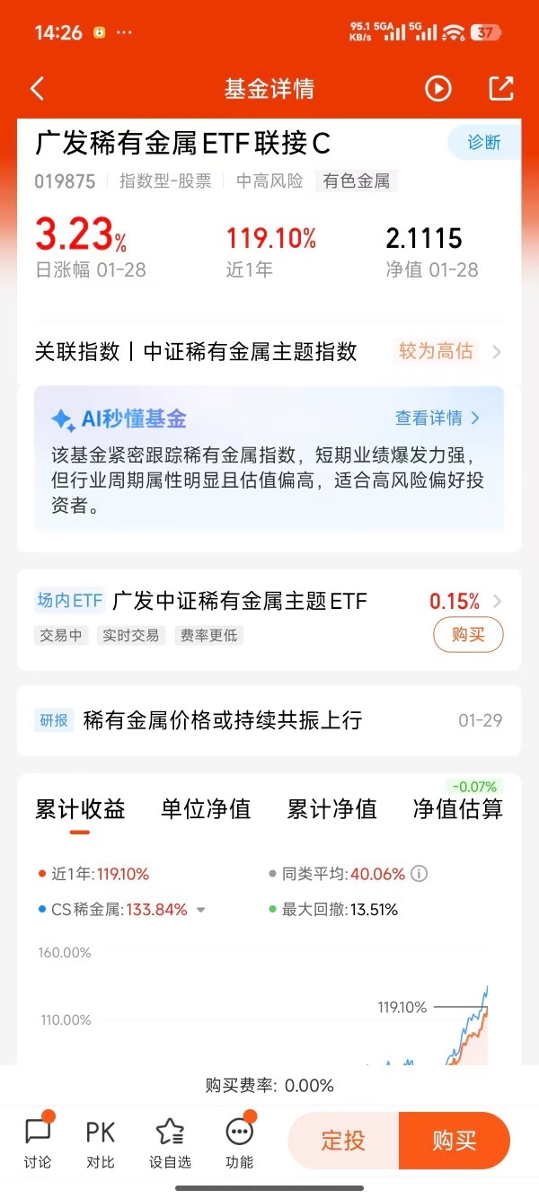 大家最近看险资的动作,聪明钱都在往资源类低估值龙头里钻,这就是风向标。广发中证稀有金属ETF联接C近一年涨幅翻倍,这种细分工具更纯粹,长期看好,如果要抓住这波行业红利,可以加仓,现在有色金属已经从冷板凳变成香饽饽了,尤其是稀土和锂矿这种,弹性非常大$广发稀有金属ETF联接C$