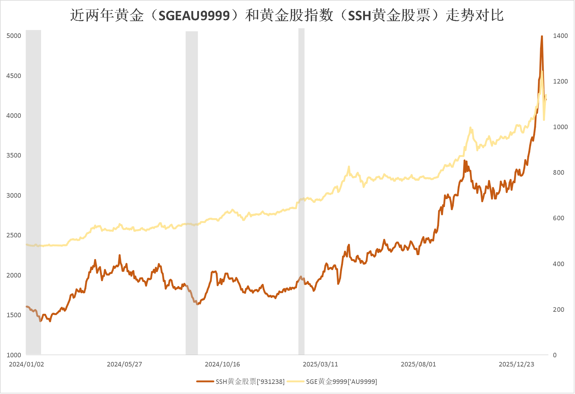 数据来源:wind,统计区间2024.1.2-2026.2.3,灰色标注为黄金和黄金股出现明显背离的区间。过往数据不代表未来表现,市场有风险,投资须谨慎。