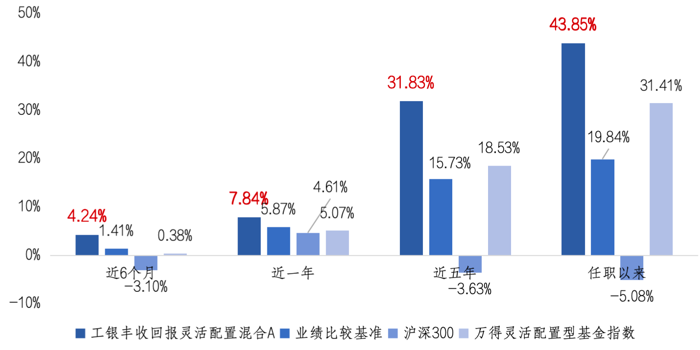 托管行及wind统计数据显示,截至今年4月30日,工银丰收回报灵活配置混合A近五年的收益为31.83%,而同期的业绩比较基准、万得灵活配置型基金指数的收益分别为15.73%、18.53%。