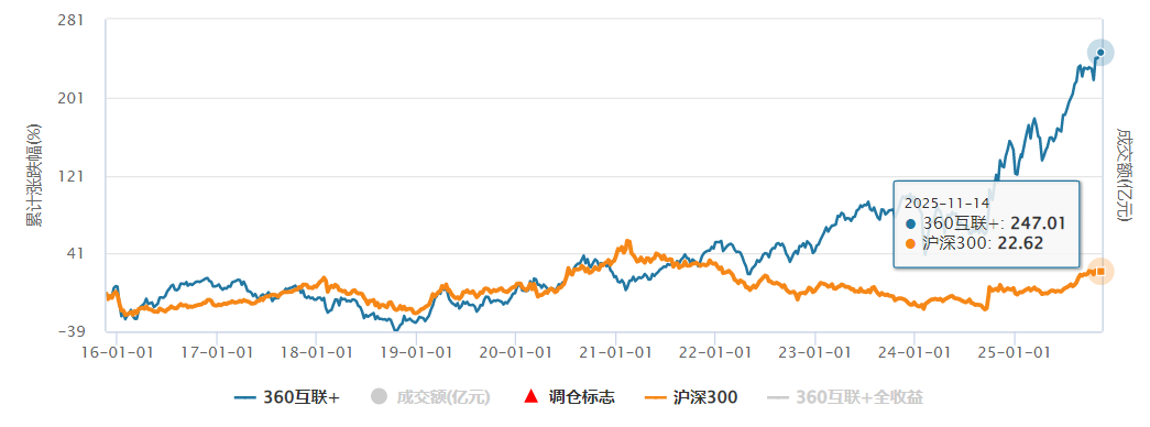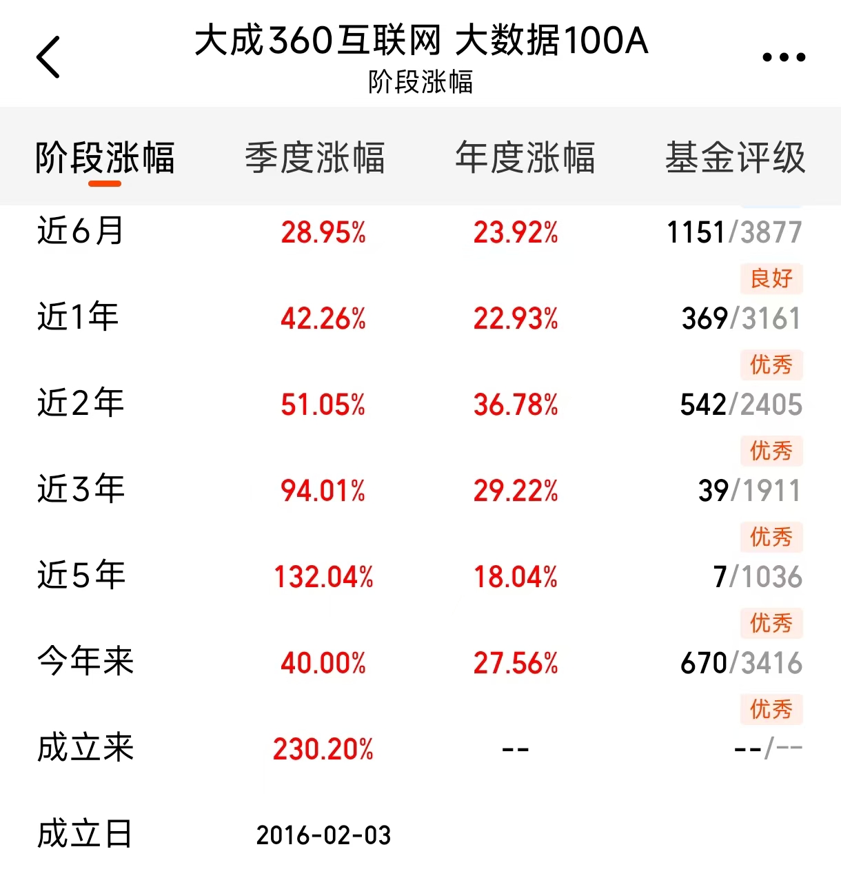 那么想要布局这个指数的话可以看看002236-$大成360互联网+大数据100A$ ,这是市面上唯一一支跟踪该指数的产品。业绩方面的话,近六月收益率达到了28.95%,近一年则为42.26%,成立以来更是达到了230%左右,多阶段业绩都很能打。