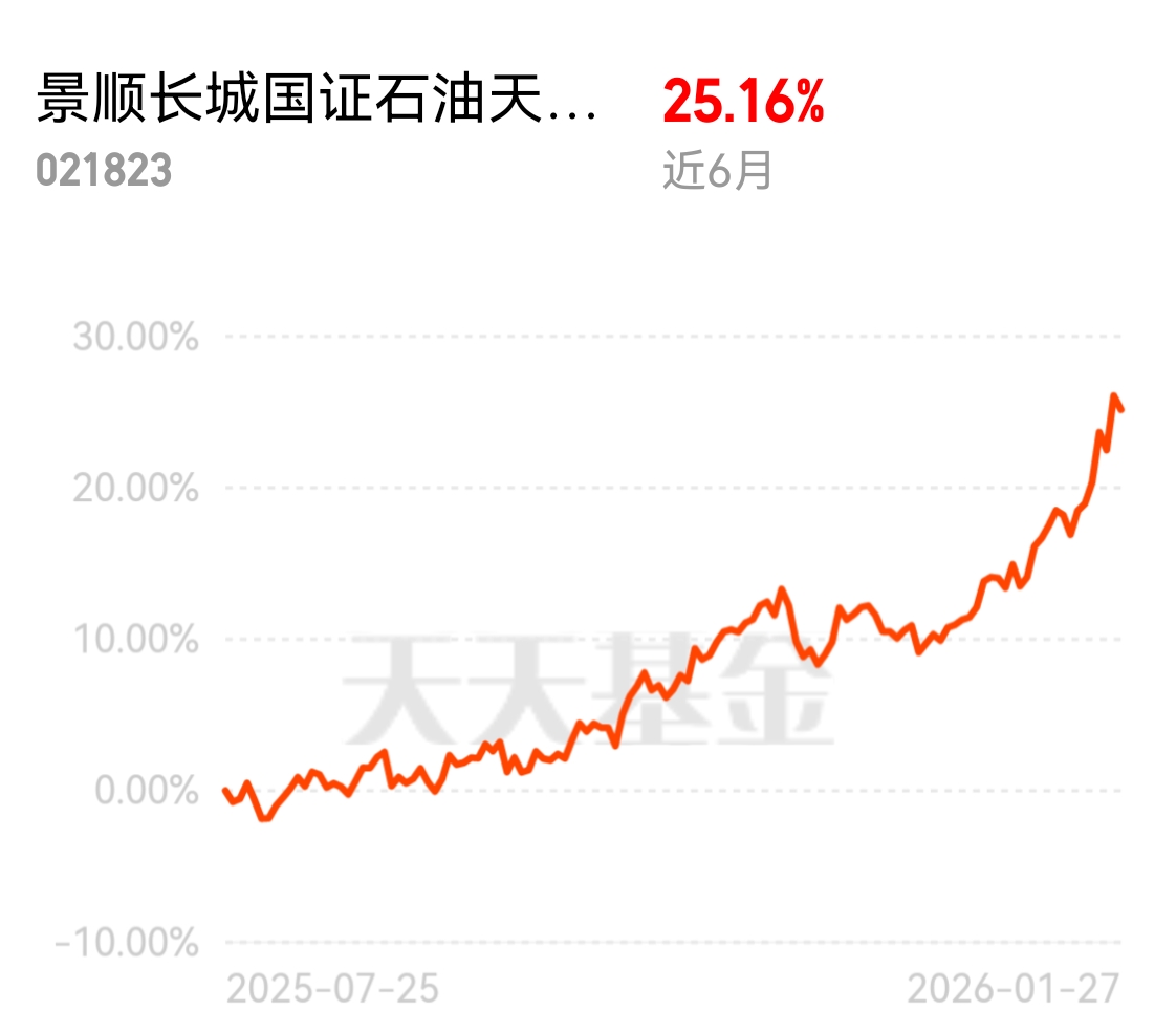 想布局油气赛道别错过,地缘政治紧张 + 美国寒潮,供给不足推高价格,贵金属油气暴涨,油价淡季不淡,景顺长城国证石油天然气 ETF 发起式联接基金 C 近 6 月 25.16%,半日涨超 4%