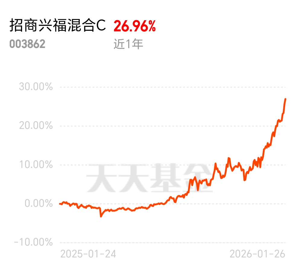 招商兴福混合 C 太给偏债混长脸了,昨天权益普跌它还跟着大涨 1%,重仓有色的布局太精准,近一周 4.46%,近 1 年 26.96%,收益一路稳涨。$招商兴福混合C$
