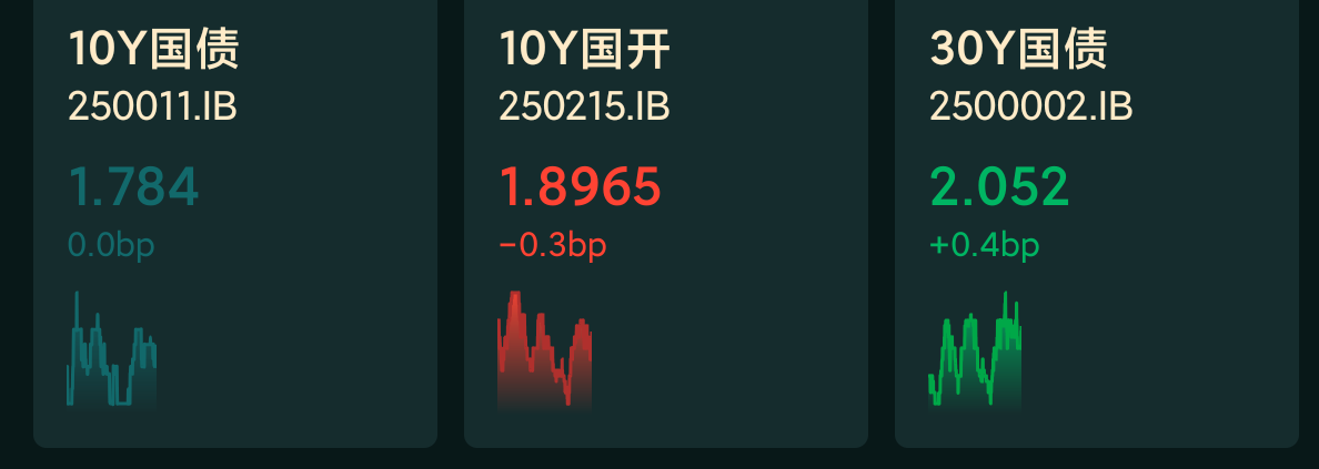 今天权益市场三大指数走低,央妈小额净回笼资金面偏紧,银行间主要利率债收益率高位震荡。10Y国债收益率于1.78%上方徘徊,30Y国债收益率上探2.055%。