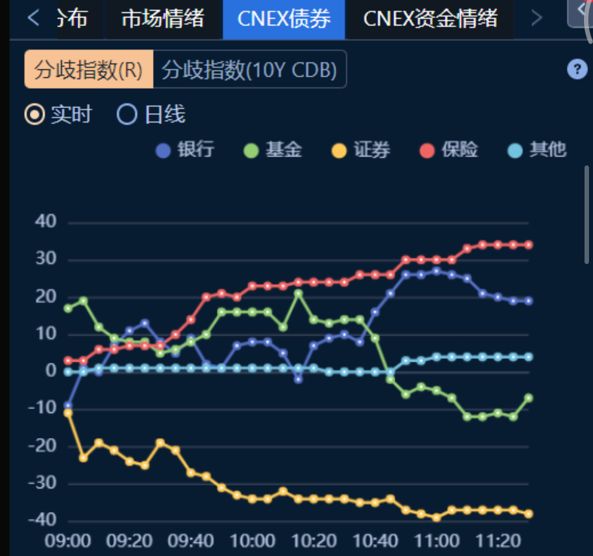 债券分歧指数显示,券商延续抛盘之势,持续大幅卖出,基金近午间也相继转为卖债,配置盘为买方主力,保险持续买入。