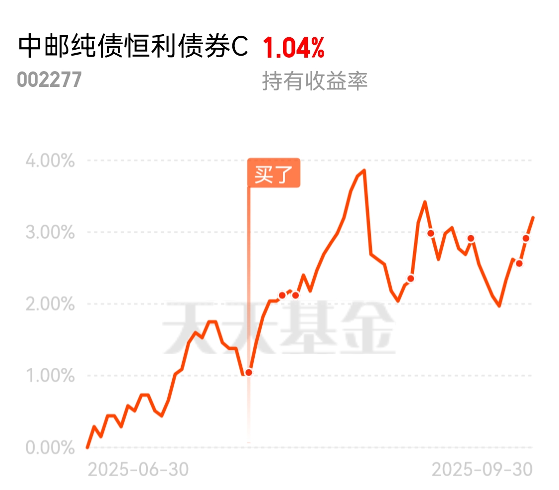 没想到被我说中了!中邮纯债恒利债券C爆蛋28个,个人持有收益率轻松突破1%了。近1年涨幅10.87%,很不错的混债基金(没有股票持仓)。