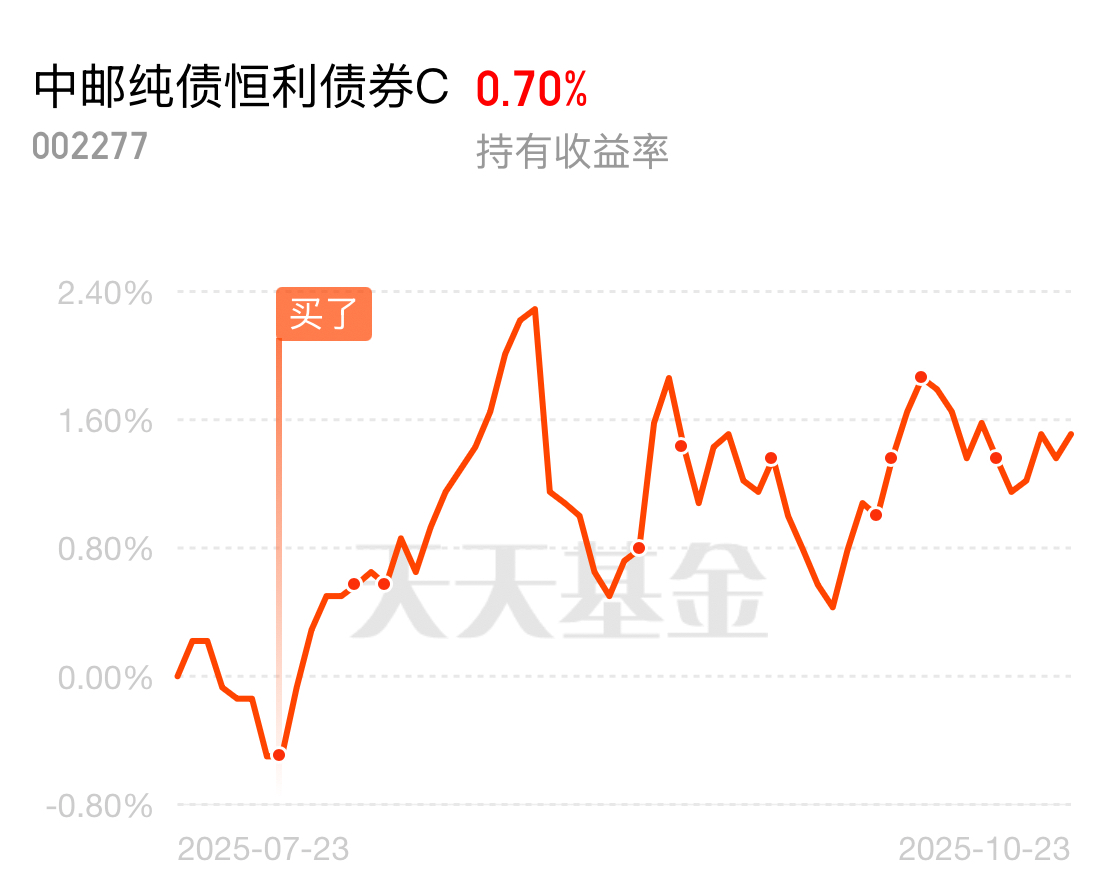 今天固收+基金中邮纯债恒利债券C产蛋14个,近1年涨幅10.19%,主投可转债+纯债,不含股票,能涨又抗跌,还是不错滴
