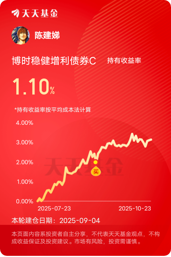 $博时稳健增利债券C$ 最近可谓蛋兴大发!债市横盘震荡,它却一路小跑,三天连涨不停歇,累计收蛋三四十个,6个月下来攒了665个蛋,这产蛋能力杠杠的!收益表现领先同类。财政部10月21日的国债做市支持操作,虽然是随卖操作,但这传递的信号非常重要,就是要维护国债市场的流动性和稳定性。对博时稳健增利来说,这种政策层面的定心丸直接降低了债券持仓的流动性风险。基金持有的那些高等级国债本来就安全边际高,现在有政策托底,估值稳定性更强,上涨的时候也更有底气。我特意研究过它的持仓逻辑,债券部分以中短久期为主,既能享受资金面宽松带来的收益,又不用承担长久期债券的利率风险。权益仓占比不高但很精准,应该是配了些科技领域的细分龙头,最近科技板块有政策利好,这部分仓位刚好能锦上添花。这种 “低波债券+精选权益”的组合,使得这基在债市走稳的时候能持续收蛋,偶尔股市发力还能多赚点,比纯债收益弹性大,又比股基波动小。盼着四季度降准能落地,这只基能有更亮眼的表现。#科技热点摊开业啦# #晒收益#