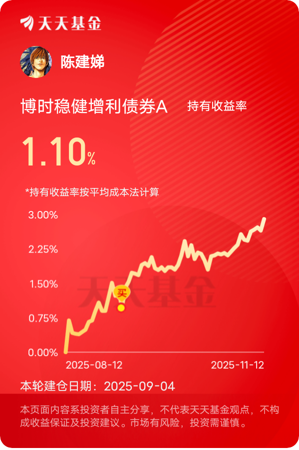 $博时稳健增利债券A$ 昨天赚了25个蛋,近一年年收益率已经稳稳站在了9.5%以上,业绩领先大部分同类产品。最近央行的流动性大礼包绝对是大利好,11月11日央行一下子放了4038亿元7天期逆回购,净投放2863亿元。债市最怕资金面收紧,现在央行这么大手笔注入流动性,相当于给市场吃了定心丸,10年期国债收益率都稳在1.8%左右了,利率债价格稳步走高。而博时稳健增利的债券仓位占比超八成,其中大部分都是国债和政策性金融债,高流动性品种占比高,在资金宽松的环境下,票息收入稳稳落袋,还能赚点资本利得,这是债基的核心底气。更惊喜的是它权益部分的爆发力,精准踩中了AI风口。这只基金的权益仓位大概20%左右,三季度重点加仓了AI软硬件和半导体板块,像中际旭创、寒武纪这些龙头股都在持仓里。最近AI产业政策密集出台,算力需求爆发,这些个股涨得特别猛,直接给基金净值添了把火。更难得的是基金经理很会控制风险,单只个股持仓不超过2%,行业分散在科技、机械等多个领域,就算某只股票回调,对整体净值影响也很小,近一年最大回撤才0.64%,稳定性优于绝大部分同类。#科技小登大揭秘# #晒收益#