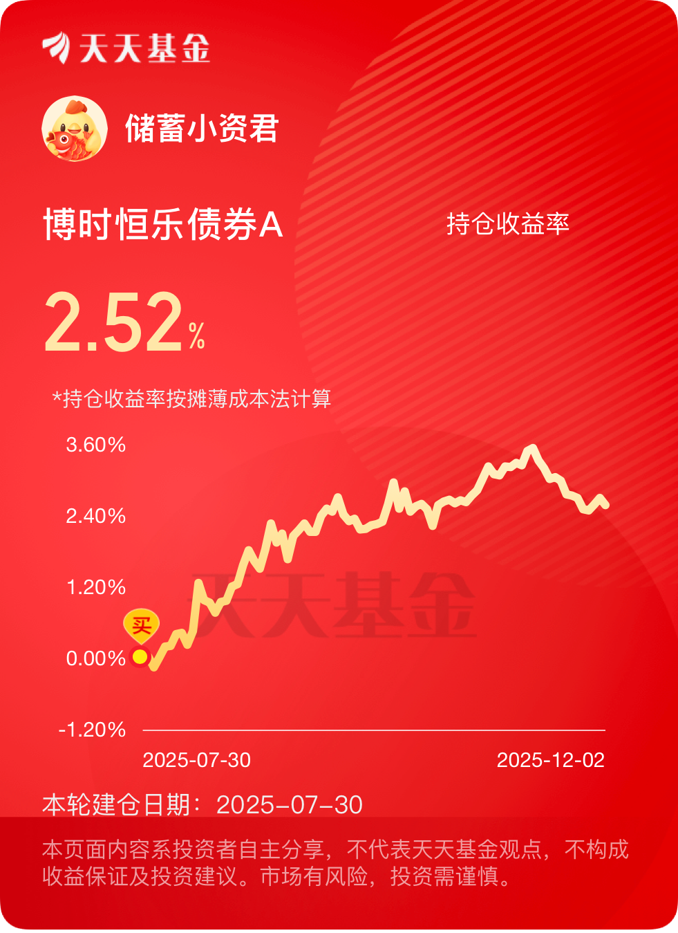 债市短期有调整,但长期逻辑依然稳固,$博时恒乐债券A$ 近半年累计收蛋545个,长期收益表现很稳健。最近它还把单日申购限额从500万调到了100万,这操作很良心,是为了保护我们老持有人的利益,控制规模追求长远。近期金融支持融资平台化债政策落地11月初央行潘功胜行长明确要建立化债框架,相当于给地方债“排雷”。博时恒乐的债券仓位超80%,重点配置了国债和政策性金融债,这些资产在化债政策下安全性大幅提升,违约风险降低,票息收益更稳。同时,央行MLF连续第九个月加量续作,11月净投放1000亿元流动性,直接推动市场利率下行,高等级信用债价格走高,基金不仅能赚票息,还能吃债券价格上涨的差价。而且它权益仓精准捕捉结构性机会,其“红利防御+科技进攻”组合最近表现绝了!红利端重点配置了能源和公用事业板块,比如中国海洋石油、长江电力,这些个股在国企分红政策强化下现金流稳定。进攻端则押注科技主线,比如半导体和消费电子,国务院近期强调金融支持科技创新,苹果新品发布带动产业链回暖,贡献了不少收益。这种配置不仅对冲了波动,还抓住了A股分化行情中的超额收益,现在正是逢低布局的好时机。##12月你看好哪条投资主线?#