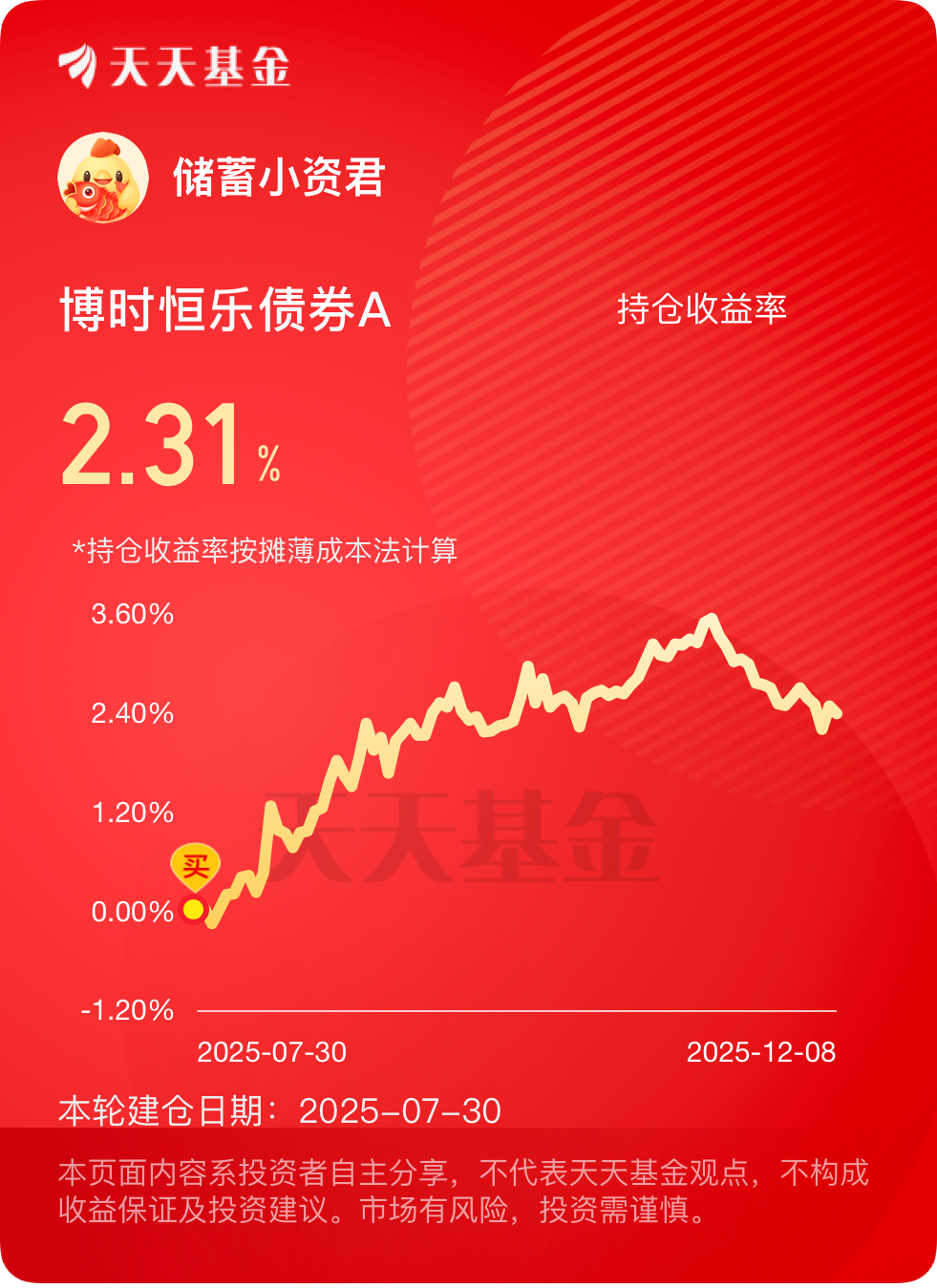 固收+在震荡市里是个宝!债基部分像压舱石一样稳,股票部分还能跟着市场喝点汤,$博时恒乐债券A$ 近六个月收益已有4.79%,业绩相当能打。且基金主动将限购从500万降到了100万,是在为长远业绩打算,这求稳为主的态度必须点个赞。美联储12月议息会议即将召开,CME数据显示降息25个基点概率高达89%,这对债市来说是直接利好,这基的债券仓位长期在80%以上,其中超65%是政策性金融债和超长期特别国债,这类利率债在降息周期里价格涨得稳,还能享受免税红利,存量券税后收益比新券高0.8%-1.2%,相当于额外多赚一笔。更惊喜的是它的权益仓位,完全踩中了当下热点,提前布局了贵金属、风电等景气行业,最近还加仓了消费电子和AI相关标的。比如它持仓的宁德时代,最近跟着新能源产业链回暖涨了不少,还有兆易创新,受益于AI芯片需求增长,单季度涨幅超15%。这只基金 20%的权益仓位,既不会因为股市波动太大影响净值,又能吃到板块上涨的红利。现在政治局会议都定调明年要“适度宽松的货币政策”,债市底子稳,而且股市3900点左右,科技股的结构性机会不错,正是布局好时机。#商业航天利好频出!如何把握投资机会?#
