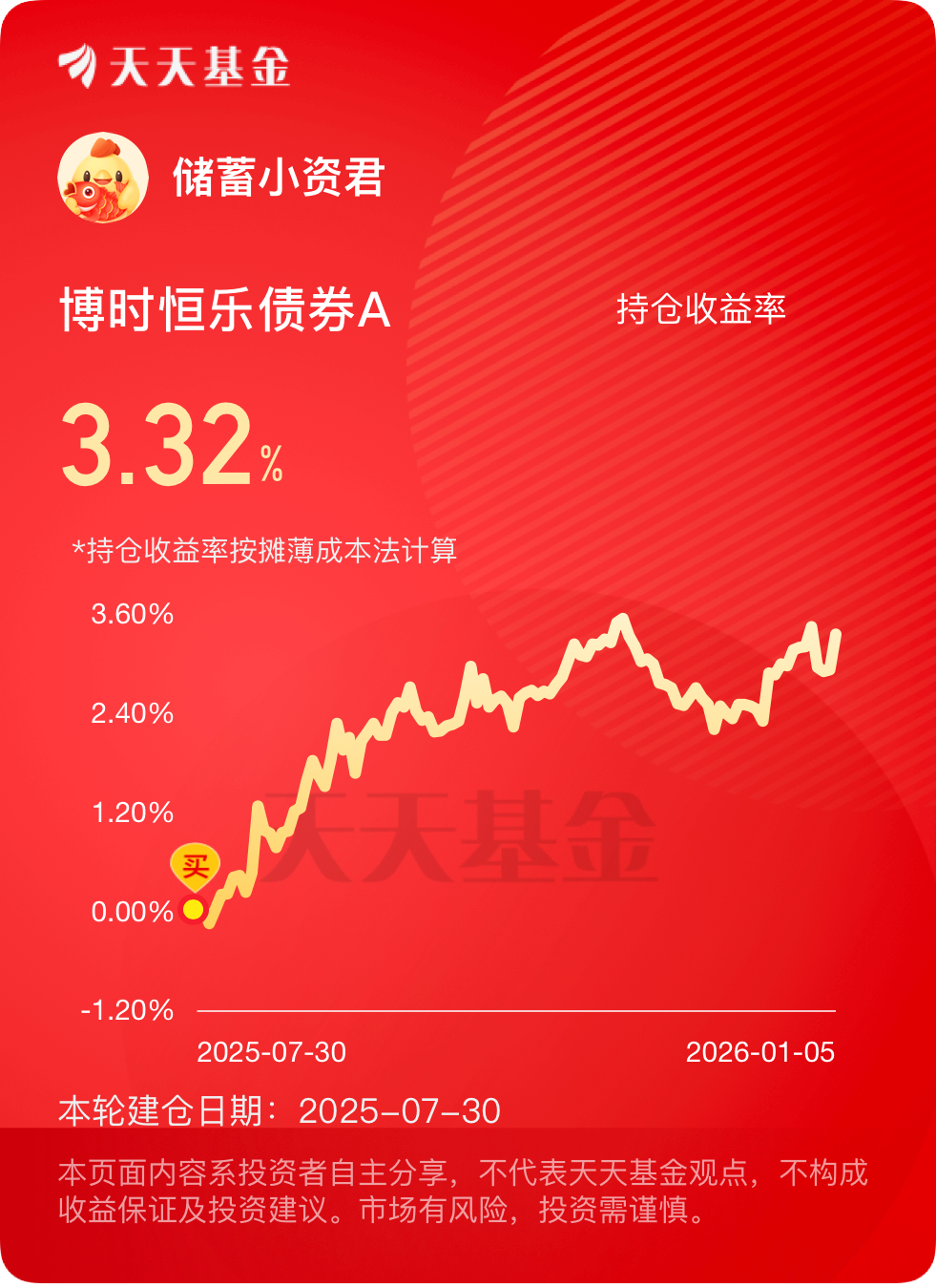 这波表现可以啊!新年第一天开门红,$博时恒乐债券A$ 一天就收了42个蛋,算下来半年得有450多个,这“下蛋”能力没话说。这只基金债券部分主投高等级信用债和利率债,债券仓位稳稳超过了80%,其中政策性金融债、超长期特别国债等利率债占比超65%。新规落地后,债基负债端稳定性大幅提升,像这类中高等级中长期信用债的利差有望修复,之前受赎回担忧被压低的估值也会慢慢回归,这也是近期基金净值稳步上涨的核心逻辑之一。而且基金经理擅长久期灵活管理,在当前资金面宽松、回购利率下行的环境下,通过合理调整久期捕捉到了不少收益,近一年7.4%的收益率在同类基里相当亮眼。更让人惊喜的是它的权益仓位,不超过20%的比例既能增强收益又不冒太大风险。这基新进了运达股份,这波新能源板块跟着大盘回暖,涨幅3.88%,成交额也有3.52亿元,这部分持仓直接为基金净值添了力。从历史持仓看,基金经理在权益部分很会选标的,不追高不盲从,聚焦业绩确定性强的个股,收益性和稳定性都不错。现在新规利好持续释放,债市流动性改善,加上这基权益端踩中新能源热点,后续表现很值得期待!#新年观察局:2026我看好的投资赛道#