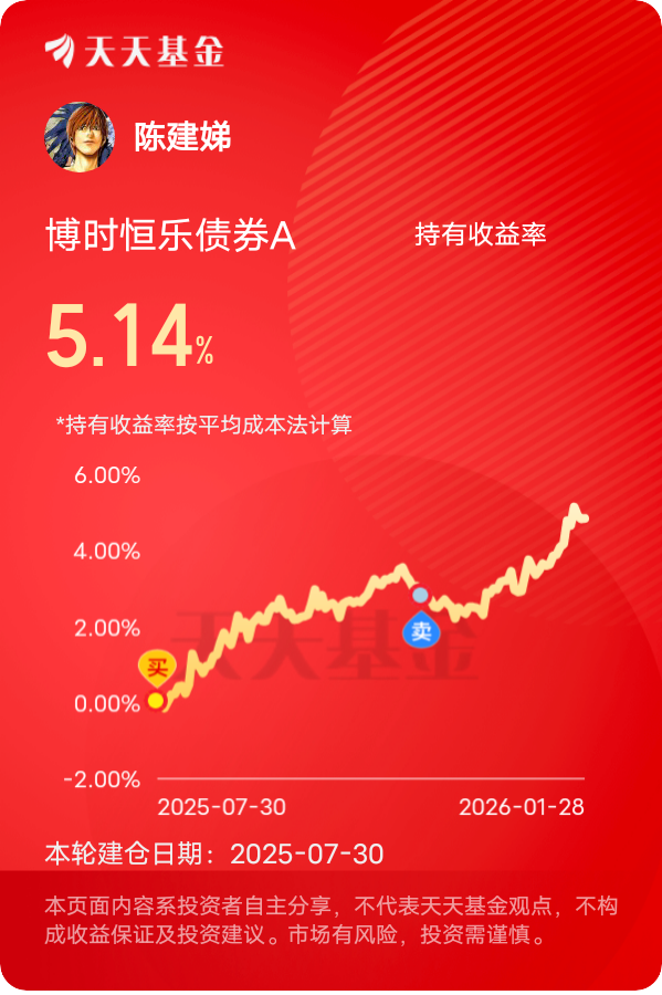 A股在4100点上方博弈加剧,债市却显得气定神闲,固收+的优势就显出来了。$博时恒乐债券A$ 主要靠债券资产求稳,再用一部分权益仓位上探收益,近一个月1.3%+,一年下来收益累计超9%,表现持续在线。近期国务院常务会议部署建立了民企债券风险分担机制,中央财政出台政策为优质民企发债提供增信支持。这个政策直接改善了民企的融资环境,降低了信用债的违约风险,对于博时恒乐这只持仓大量高等级信用债的基金来说,无疑是重大利好。之前还担心信用债有违约风险,现在有了政策支持,信用债市场越来越稳健,这只基的债券部分收益也更有保障了,而且优质信用债的收益率也在稳步提升,简直双丰收的节奏!其权益仓的配置也相当聪明,新增的中国太保、华泰证券这两只蓝筹股,简直是神来之笔。1月份机构策略里明确提到要增配非银板块,券商、保险板块迎来估值修复行情,中国太保作为保险龙头,估值一直处于低位,后续修复空间很大。华泰证券作为券商龙头,受益于市场交投活跃,业绩有望持续提升。现在债市有政策托底加上市场流动性充裕,权益仓还能蹭上市场热点,咱抱紧了跟着稳稳收蛋就行!#2026年 你最看好哪些投资赛道?# #晒收益#