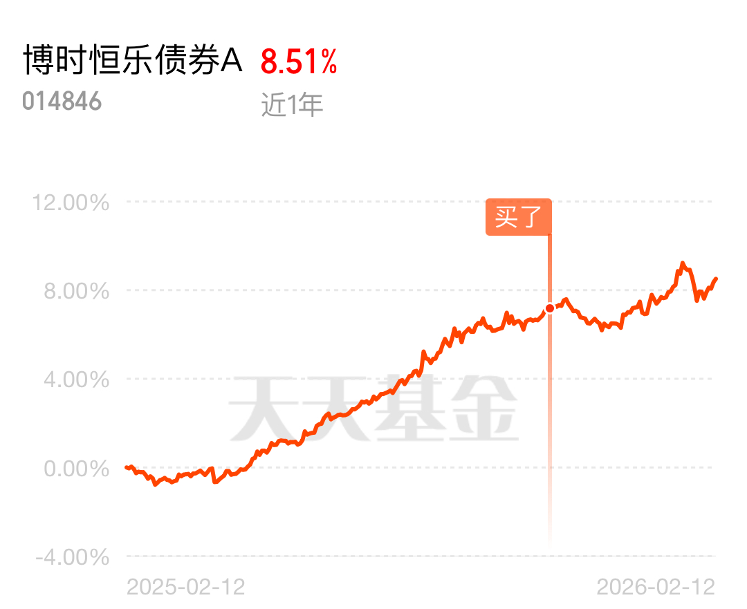 债市平稳向上走,股市在4100点反复试探的行情下,固收+表现很不错。$博时恒乐债券A$ 走得挺稳,以债券为主,也适当配点股票,收益挺实在的。昨天14个蛋稳稳入账,六个月下来接近4%的回报,短期和长期都表现挺好。央行2月12号刚搞的10000亿元6个月期买断式逆回购操作,净注入差不多5000亿元资金。这简直就是央行给市场“撒钱”,保障春节前银行体系流动性充裕,资金面一宽松,债市就跟着吃香,债券基金自然跟着喝汤。本来债券的核心就是靠稳赚利息,现在有央行托底,资金面宽松,短端利率下行,博时恒乐的债券部分简直如鱼得水。它的权益仓表现更是让人惊喜,持仓里的藏格矿业和中矿资源这俩妥妥的新能源上游核心标的,有色板块最近涨得那叫一个猛,市值一路飙升。藏格矿业是国内锂矿龙头,手里握着优质的锂资源,现在新能源汽车、储能行业发展得这么猛,锂的需求只会越来越大,长期来看,业绩肯定稳中有升,根本不用担心后续乏力。还有中矿资源,不仅有锂矿,还布局了海外的稀土和锂盐湖,稀缺性拉满!现在全球都在抢新能源上游资源,中矿资源的海外布局直接占了先机,既能规避国内资源竞争的压力,还能享受全球新能源发展的红利。#稀土小金属走强 战略资源价值重估持续?#