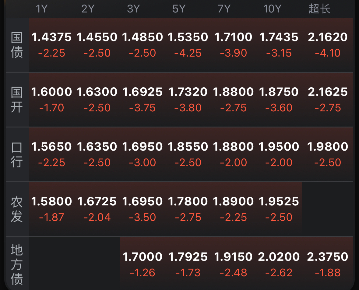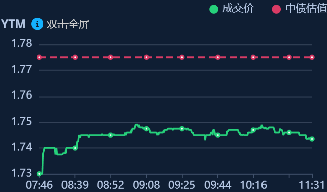 二、十年期国债收益率:1.7435 -0.0315%(国债收益率越涨,债市越跌,两者反向关系)