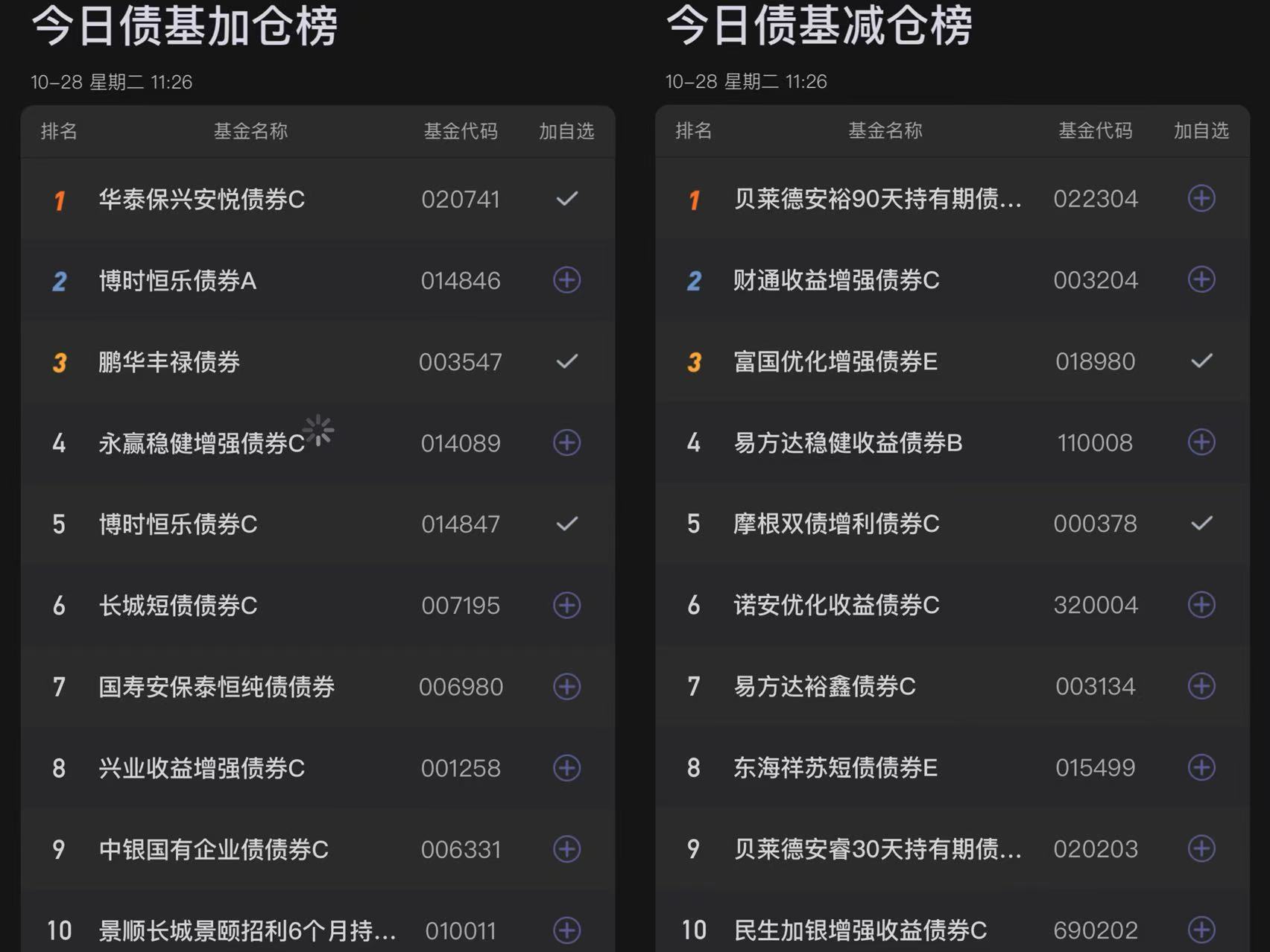 $华泰保兴安悦债券A(OTCFUND|007540)$ $南方中债7-10年国开行债券指数E(OTCFUND|013594)$ $国泰惠丰纯债债券A(OTCFUND|007214)$ $博时恒乐债券C(OTCFUND|014847)$ $富国优化增强债券E(OTCFUND|018980)$ $华夏双债债券A(OTCFUND|000047)$ $易方达增强回报债券A(OTCFUND|110017)$ $国泰惠丰纯债债券C(OTCFUND|021249)$ $东方添益债券(OTCFUND|400030)$ $永赢稳健增强债券C(OTCFUND|014089)$ #沪指盘中突破4000点!下个目标位在哪?#