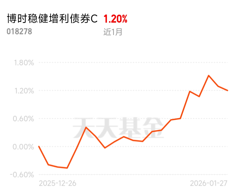 我的配置思路很简单,纯债主防守,固收+用来进攻。一个月稳稳1.2%+到手,股债互补确实省心,净值下来我就加点仓,多攒份额等上涨$博时稳健增利债券C$