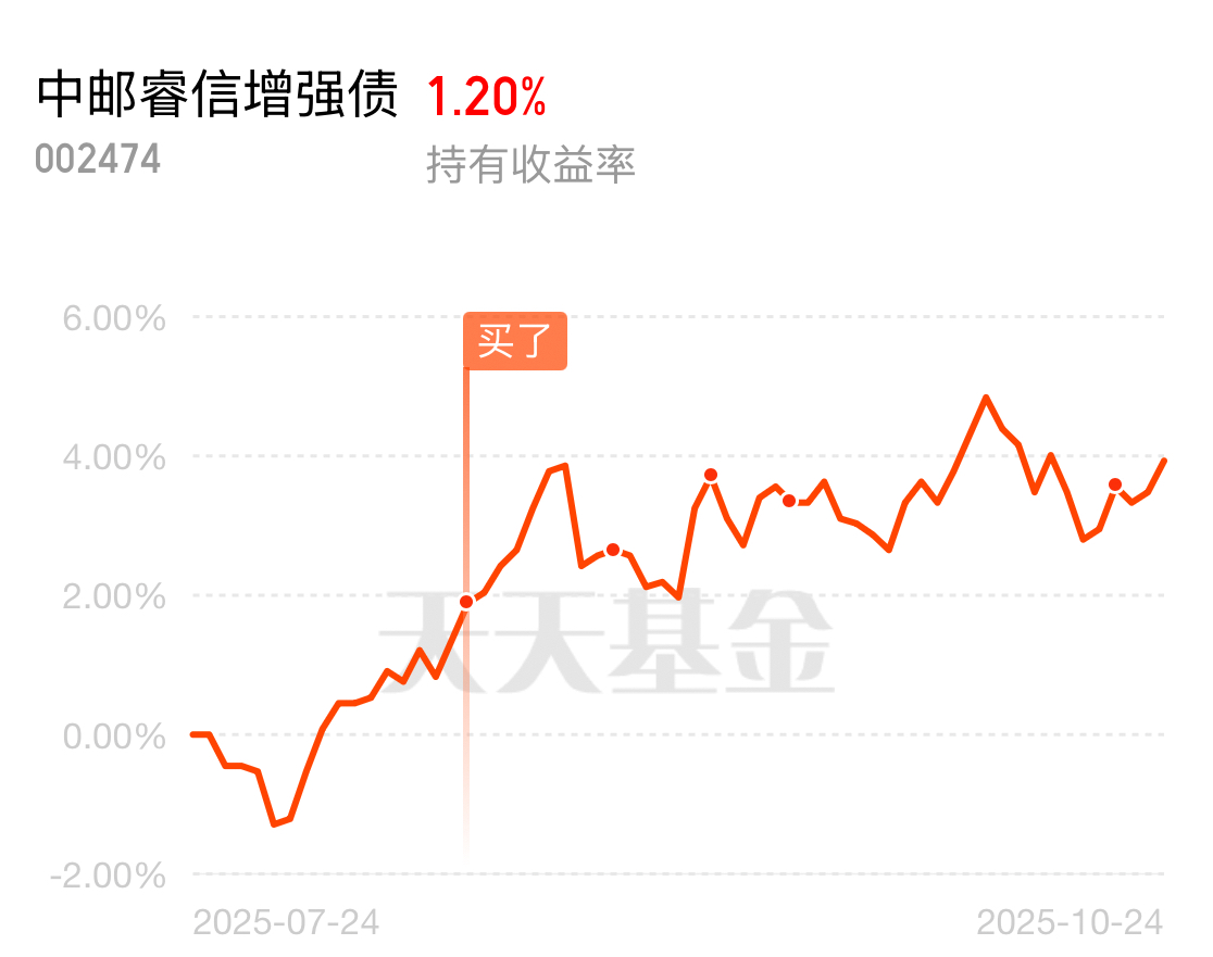 混债还是有大大惊喜的!今天个人持有的中邮睿信增强债爆蛋了44个,还是很给力的,近1年涨幅16.24%!