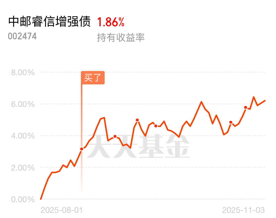 又是14个蛋!中邮睿信增强债跟上周五一样都是小爆蛋啊!近1年涨幅17.44%,性价比较高的固收+基金,个人持有收益率已经1.86%了(分批进的),持有体验还不错。