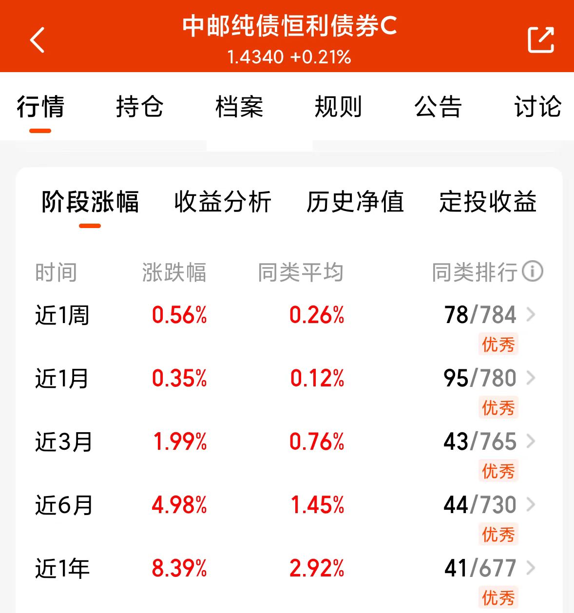 姚姚建仓5000元近期频频爆出恐龙蛋的$中邮纯债恒利债券C(OTCFUND|002277)$其主打可转债+纯债双策略,无任何股票持仓,基金经理会根据市场节奏灵活调整品种配比,既能严控组合波动,又能有效拉升收益弹性。在当下债市震荡的行情里,这只基表现亮眼:昨日单日爆蛋21个,近一周涨幅0.56%,近三个月涨1.99%,近六个月斩获4.98%收益,近一年更是拿下8.39%的亮眼回报!关键是它的最大回撤仅2.15%,比不少纯债基金的回撤都更小,妥妥的涨得多、跌得少,还总能悄悄爆出大蛋,各阶段业绩均大幅跑赢同类平均水平。
