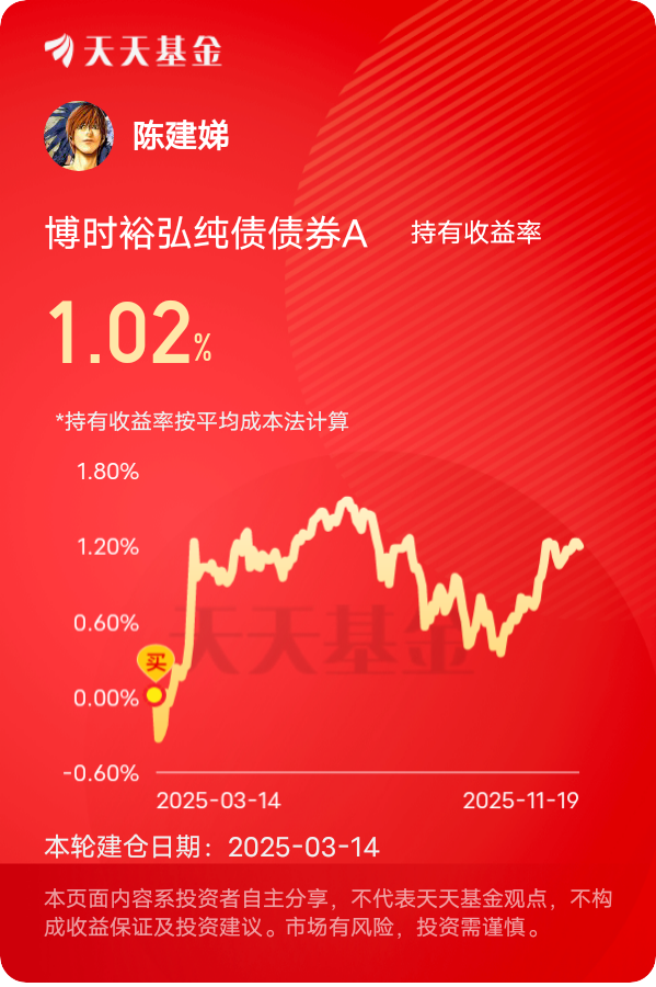 央行一直在维护流动性,资金面宽松对债市是好事,这基近期涨多跌少,历史业绩也很不错,拿着踏实。#晒收益#