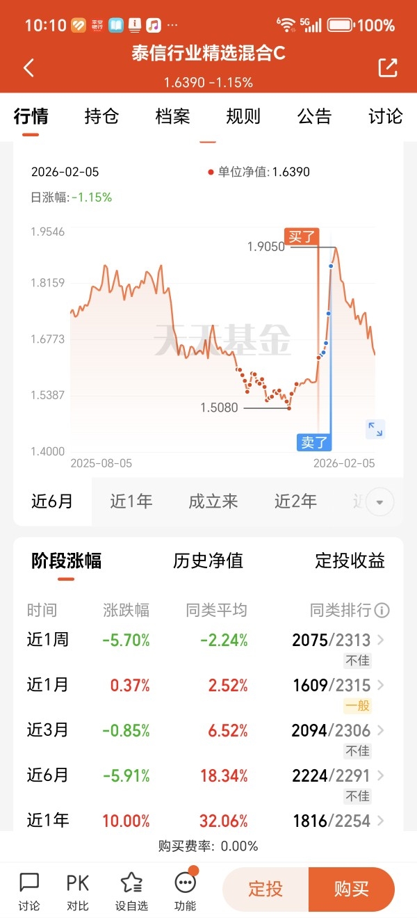 上一个波段买的比较对,但卖的不对,卖出过早,1月6日卖出二分之一,错过了大涨行情。1月6日卖出的净值是1.6390,现在的净值也是1.6390,所以决定今天开始新的一个波段。