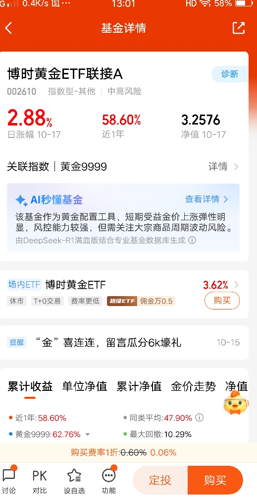 黄金作为与股票,债券毫不相干的资产,是可以成为我们长期投资的稳定资产,因为它与股票、债券的负相关性,我们就有配置它的必要性。世界最著名的投资机构桥水基金,都是将黄金作为长期的配置资产,而且该机构的投资收益也是非常可观的,所以我认为投资黄金是可行的。$博时黄金ETF联接A$ @博时基金