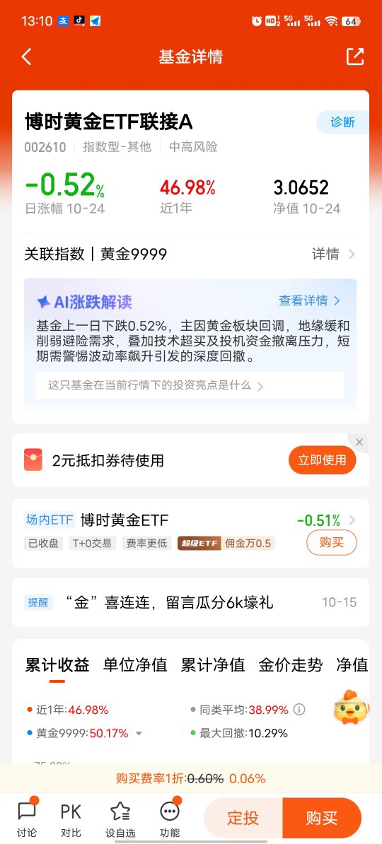 2025年已经进入四季度,现在是10月末,本月初中美两国又开始了关税战,使一些避险资金买入黄金资产,加上各国央行一直在增持黄金,我国央行已经连续多月增持黄金,所以进入10月以来黄金价格又开始上涨了,按照黄金的上涨周期来看,黄金的历次上涨周期都达01年之久,而且目前看黄金也才连续上涨4年,所以不管是从短期还是长期看,买入黄金都是正确的选择。$博时黄金ETF联接A$ @博时基金