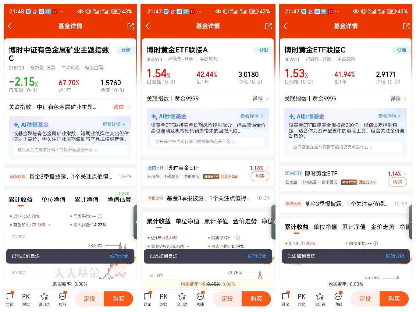 金融类黄金包括黄金ETF、黄金ETF联接基金、纸黄金等,兼具流动性与便利性,是稳健型投资者参与黄金市场的最佳选择。其中,黄金ETF联接基金因门槛低、费率优的特点,尤为适合普通投资者。以$博时黄金ETF联接A$ 为例,其管理费+托管费处于同类最低一档,且持有满7天免赎回费,极大降低了投资成本。