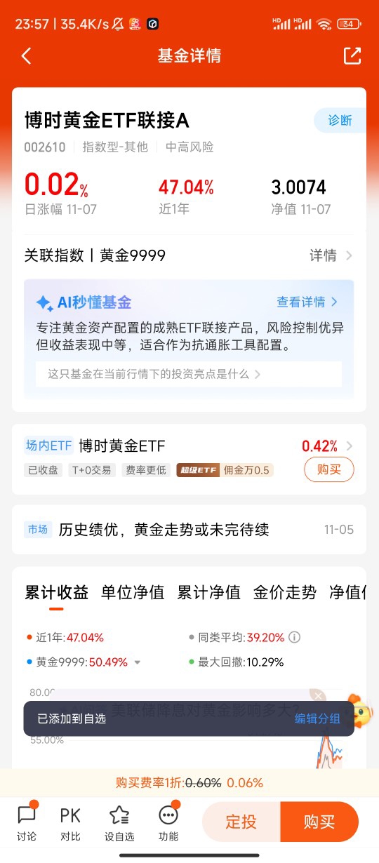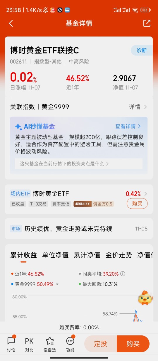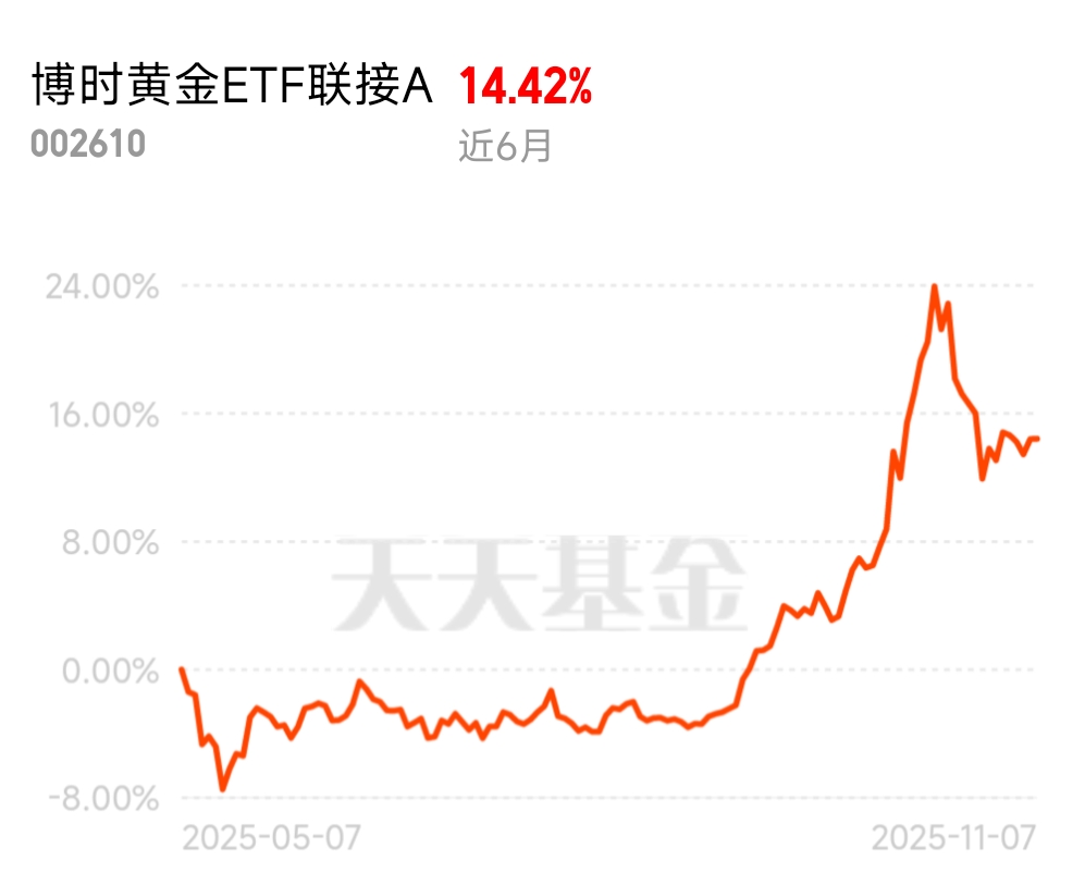 博时黄金ETF联接A的管理费仅0.6%,低于实物黄金2%-5%的溢价,且无存储成本。其跟踪标的为上海黄金交易所AU99.99收益率,年化跟踪误差仅0.08%(远低于股票ETF),能精准反映金价波动。2025年10月,该基金净值涨幅达4.51%,年化回报51.24%,在同类产品中表现优异。
