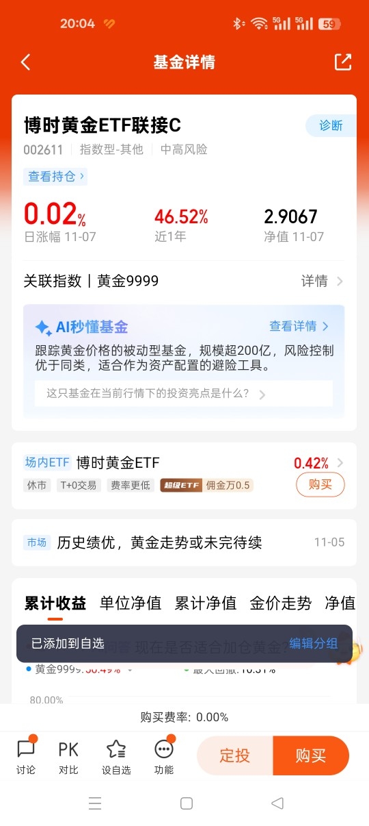 作为跟踪黄金价格的优质工具,博时黄金ETF联接A的产品特性与当前市场环境高度契合。该基金属于指数型联接基金,核心投资于黄金ETF,间接跟踪国际金价走势,截至2025年11月6日,基金净值达3.0068元,成立以来分红再投入年化收益率达12.36%,长期收益表现稳健。在费率方面,其管理费率0.5%+托管费率0.1%的组合在同类产品中具备竞争力,远低于主动管理型黄金主题基金,能有效降低长期投资成本。基金规模达50.10亿元,适中的规模既保证了资金运作的灵活性,又避免了小规模基金可能面临的流动性风险,2025年9月单月最高涨幅达4.45%,精准捕捉了金价上涨红利 。从跟踪效果来看,国内主流黄金ETF联接基金年化跟踪误差通常控制在0.5%-1%,博时凭借成熟的指数管理能力,能够紧密贴合黄金价格波动,让投资者高效分享金价上涨收益。