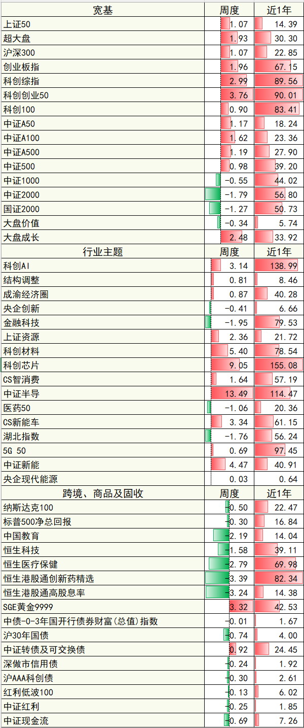 数据来源:上海证券交易所,深圳证券交易所,中证指数有限公司,上海黄金交易所,中央国债登记结算有限责任公司,纳斯达克股票市场公司,标准普尔公司,恒生指数有限公司,WIND,博时基金,周度统计区间2025.9.22-2025.9.28,近一年统计区间2024.9.28-2025.9.28。指数历史表现不预示未来,不代表相关产品收益。