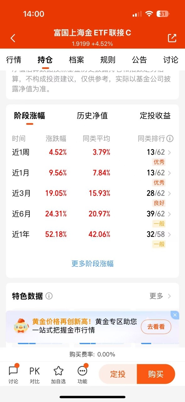 准备继续布局一点黄金跟上这波行情,我看隔壁富国$富国上海金ETF联接C$就是不错