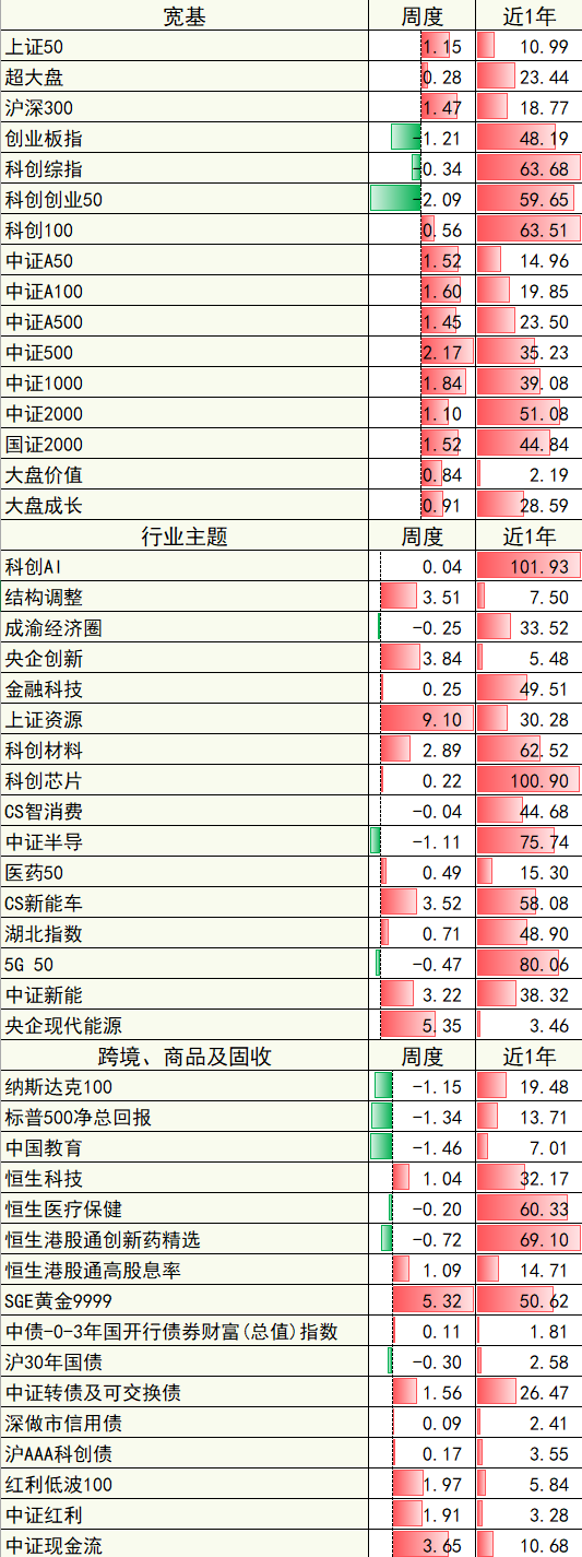 数据来源:上海证券交易所,深圳证券交易所,中证指数有限公司,上海黄金交易所,中央国债登记结算有限责任公司,纳斯达克股票市场公司,标准普尔公司,恒生指数有限公司,WIND,博时基金,周度统计区间2025.9.29-2025.10.12,近一年统计区间2024.10.12-2025.10.12。指数历史表现不预示未来,不代表相关产品收益。