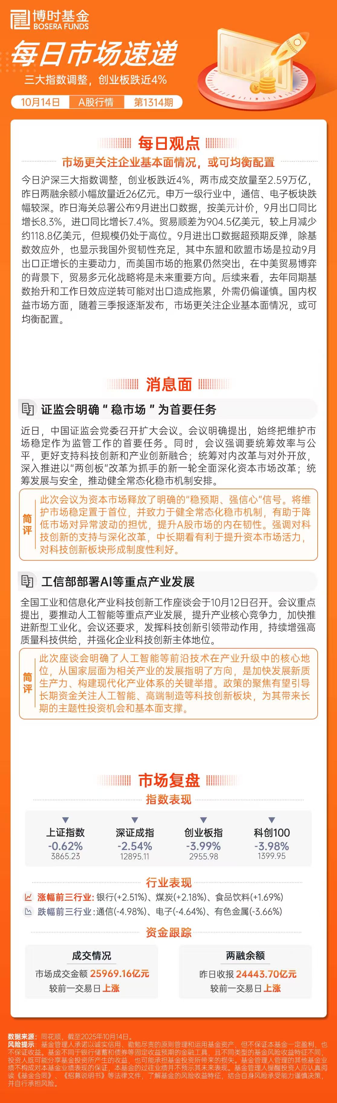 【博时市场点评10月14日】三大指数调整,创业板跌近4%