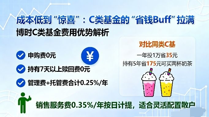 - 博时这只C类,申购费0元(不用给“入场费”),持有7天以上赎回费也0元(急用钱随时卖,不亏手续费);