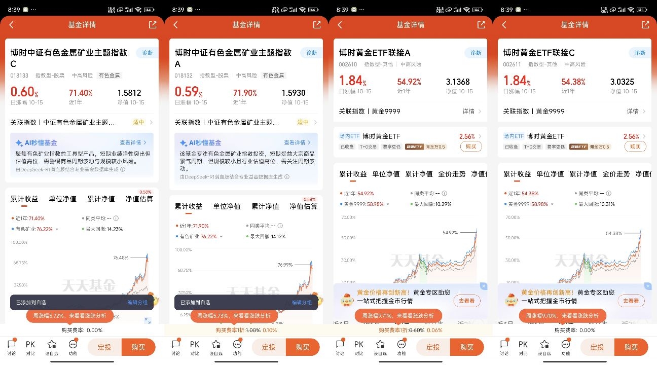 确定黄金赛道值得配后,接下来就是“选工具”。实物黄金变现坑(帮妈妈卖过一次金条,折价+手续费亏了200多)、黄金期货杠杆高(普通人玩不起),最后锁定了黄金ETF联接基金,而博时这只,是我对比下来的“最优解”: