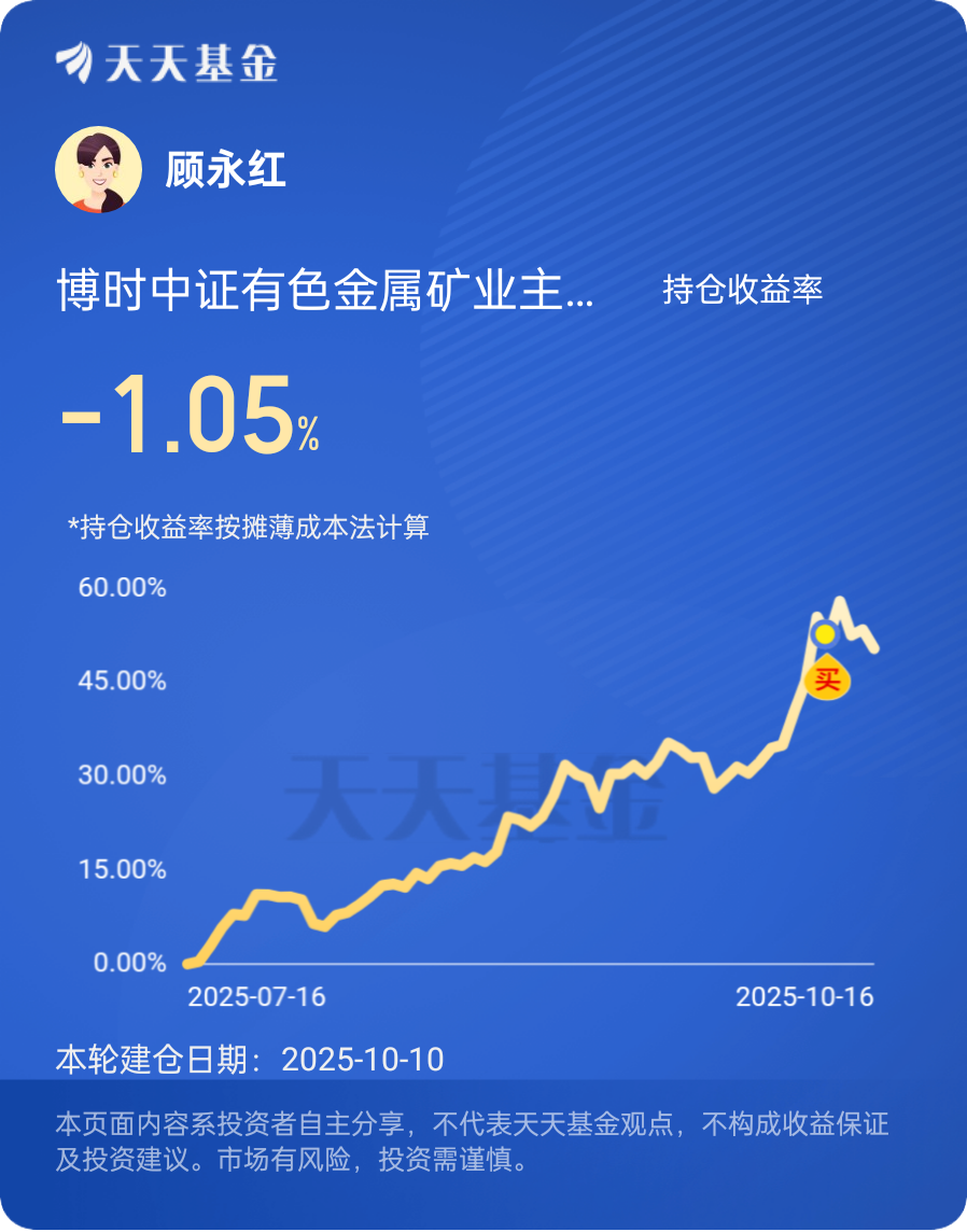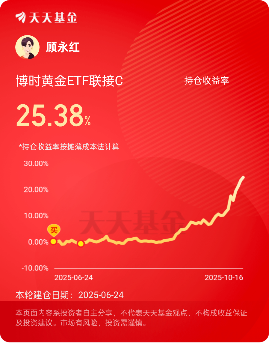 10月16日,国际金价站上4300美元/盎司,年内涨超50%,在这个金价闪耀的欣喜时刻,聊聊我跟黄金的“爱恨情仇”:我从6月份开始买入$博时黄金ETF联接C$ ,到短短四个月时间,已经盈利25.38%,给我带来了很好的收益回报和持有体验!让我欢喜万分!我爱你——黄金,我爱你——博时黄金ETF联接基金!10月上旬,又开始定投了$博时中证有色金属矿业主题指数C$,我会坚持定投并坚定持有!