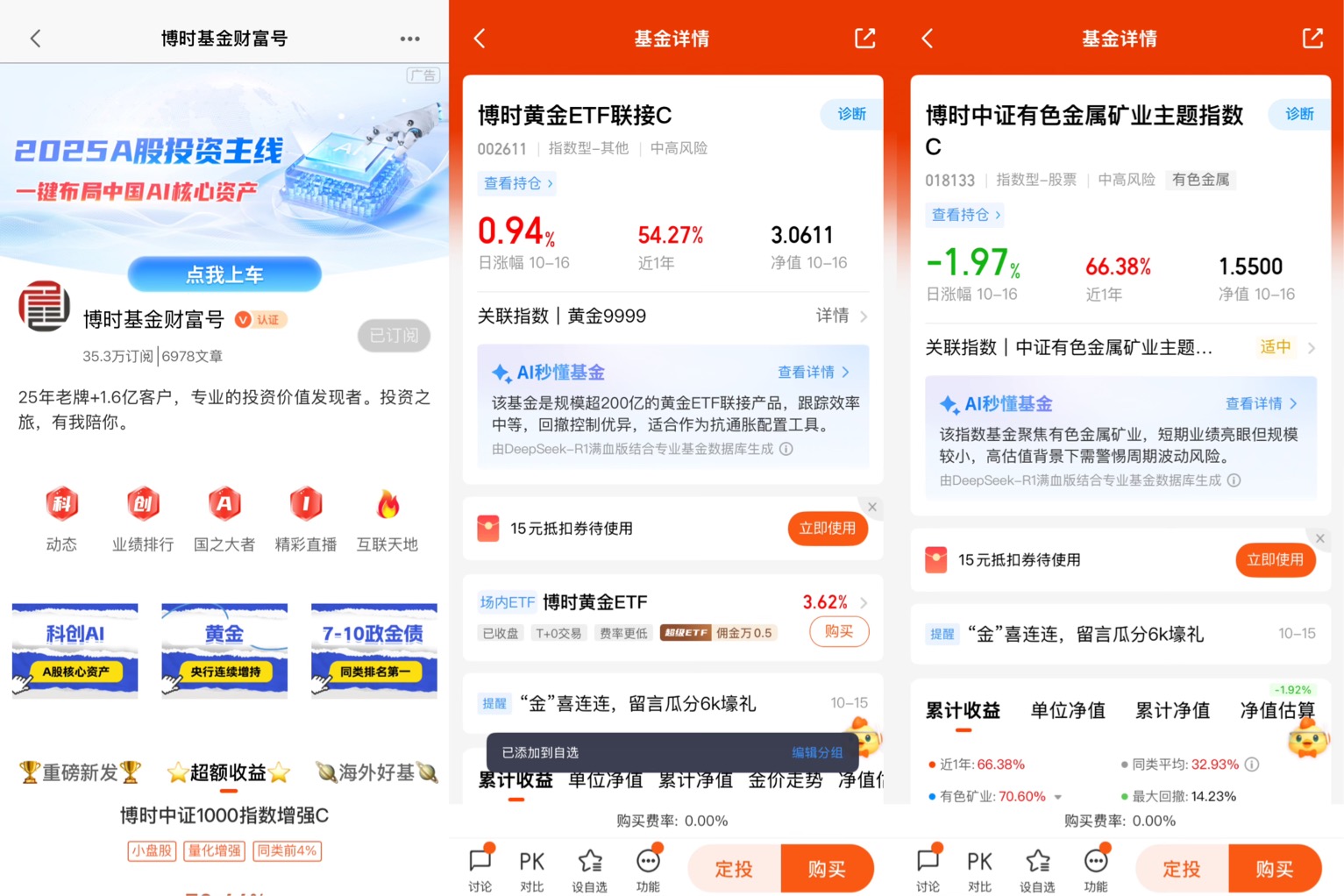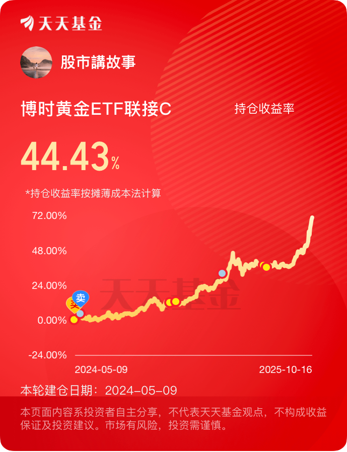 我从去年五一节后,开始买了入$博时黄金ETF联接C$ ,上周又开始定投了$博时中证有色金属矿业主题指数C$ ,获得了非常好的收益回报和持有体验!面对金价持续上涨,我会继续定投,并且坚定持有!因为美联储降息周期、各国央行持续购金以及地缘冲突难以解决等,会支持黄金资产延续长牛行情。