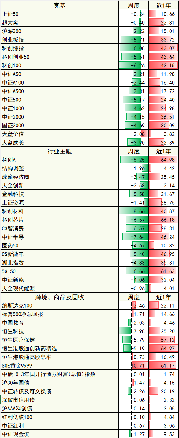 数据来源:上海证券交易所,深圳证券交易所,中证指数有限公司,上海黄金交易所,中央国债登记结算有限责任公司,纳斯达克股票市场公司,标准普尔公司,恒生指数有限公司,WIND,博时基金,周度统计区间2025.10.13-2025.10.19,近一年统计区间2024.10.19-2025.10.19。指数历史表现不预示未来,不代表相关产品收益。