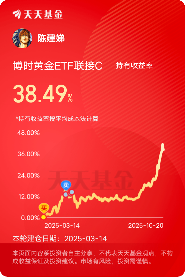 我是黄金,在避险与投机的天平上,在短期与长期的博弈中,我期待与你一起在市场中找到属于自己的机会。看好博时黄金ETF联接C,收益满意,逢低加仓,让我们在黄金的世界里,把握当下,布局未来。”@博时基金 #晒收益#