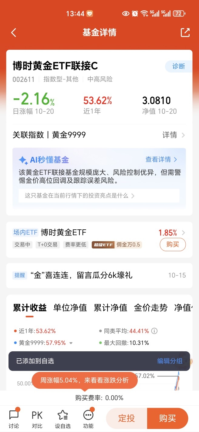 - 紧密跟踪金价:博时黄金ETF联接C主要投资于博时黄金ETF,间接持有上海黄金交易所挂牌交易的Au99.99黄金现货合约,基金资产中投资于黄金ETF的比例不低于90%,能高效跟踪黄金价格。2025年以来,国际金价累计上涨52%,该基金的净值增长率达51.8%,跟踪误差控制在0.3%以内,远超同类产品平均水平。