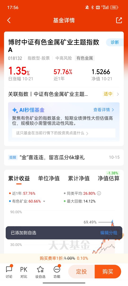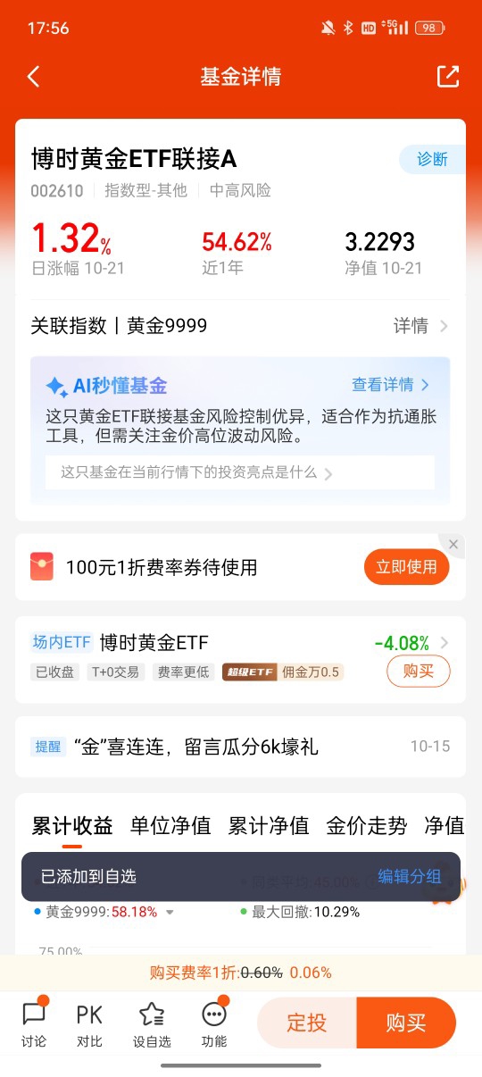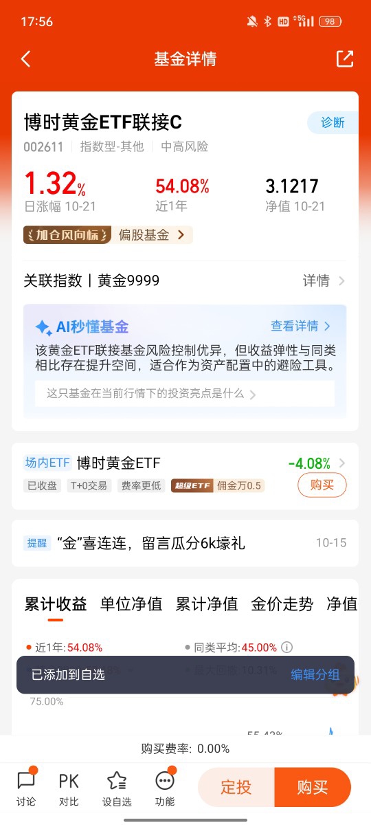 从产品特性来看,博时黄金ETF联接C也十分适配定投需求。它运作成本低于银行积存金(通常合计1%手续费),且持有7天以上免赎回费,大幅降低长期定投的交易成本;支持小额定投,门槛远低于实物黄金,操作流程简单,设置自动扣款即可,省时省心;同时净值变动与国际金价高度挂钩,截至10月21日最新净值3.1217,日涨跌幅1.32%,能精准捕捉黄金资产的长期收益,避免其他黄金相关产品的溢价偏差。