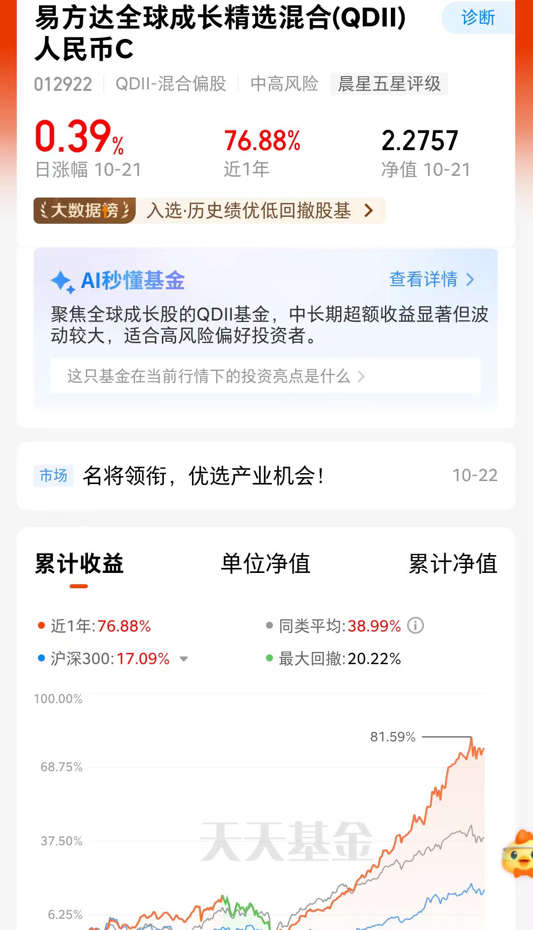 虽然当下科技板块普涨行情,但是全球科技板块各有优势,单看一个市场容易踏空或者风险较高,那怎么办呢?不妨就选择易方达全球成长精选混合(QDII)C012922,他的策略是投全球科技(A、H、美股都能投)灵活规避政治风险,同时可以把握多个市场的科技成长机遇。而且科技长期没走完,海内外都有很大机会,降息周期开启,全球科技类资产有望受益,所以就选这只布局全球科技的。