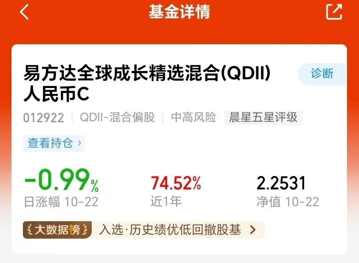 易方达全球成长精选混合C这个感觉还不错,能投全球科技龙头,不押单市场,港股、美股 AI算力都能沾上边。最近板块调整,这基回撤控得好,基金经理有水平,近一年涨 74.52% 超同类,我打算接着拿来看看。#高盛看多A股:慢牛正形成 还有约30%上涨空间#
