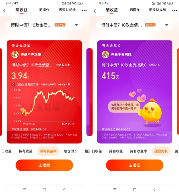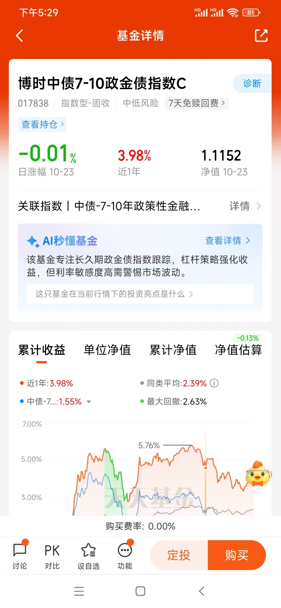 除了黄金,我最近也打算增加债券基金的配置。去年9月,我买了博时中债7-10年政金债指数C(017838),目前的收益率大概是3.94%。对比今年的股债跷跷板效应,我觉得能有这个收益已经不错了。债券基金的优势就是相对稳健,特别是在市场动荡的时候,它能有效地平衡其他高风险资产的波动。