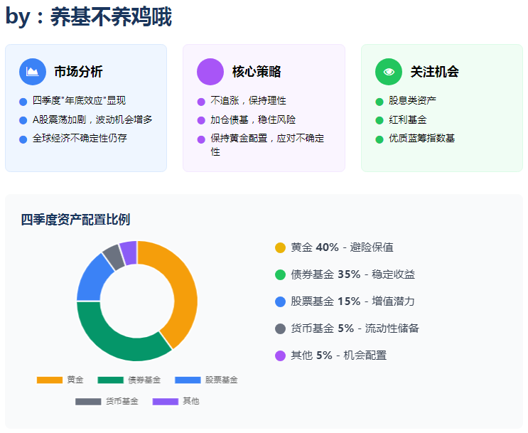 总体而言,我的四季度资产配置计划就是:黄金 债基。黄金继续作为避险和保值的工具,债基则用来稳定收益和降低整体波动。在市场不确定性较高的背景下,保持稳健是我最重要的目标。