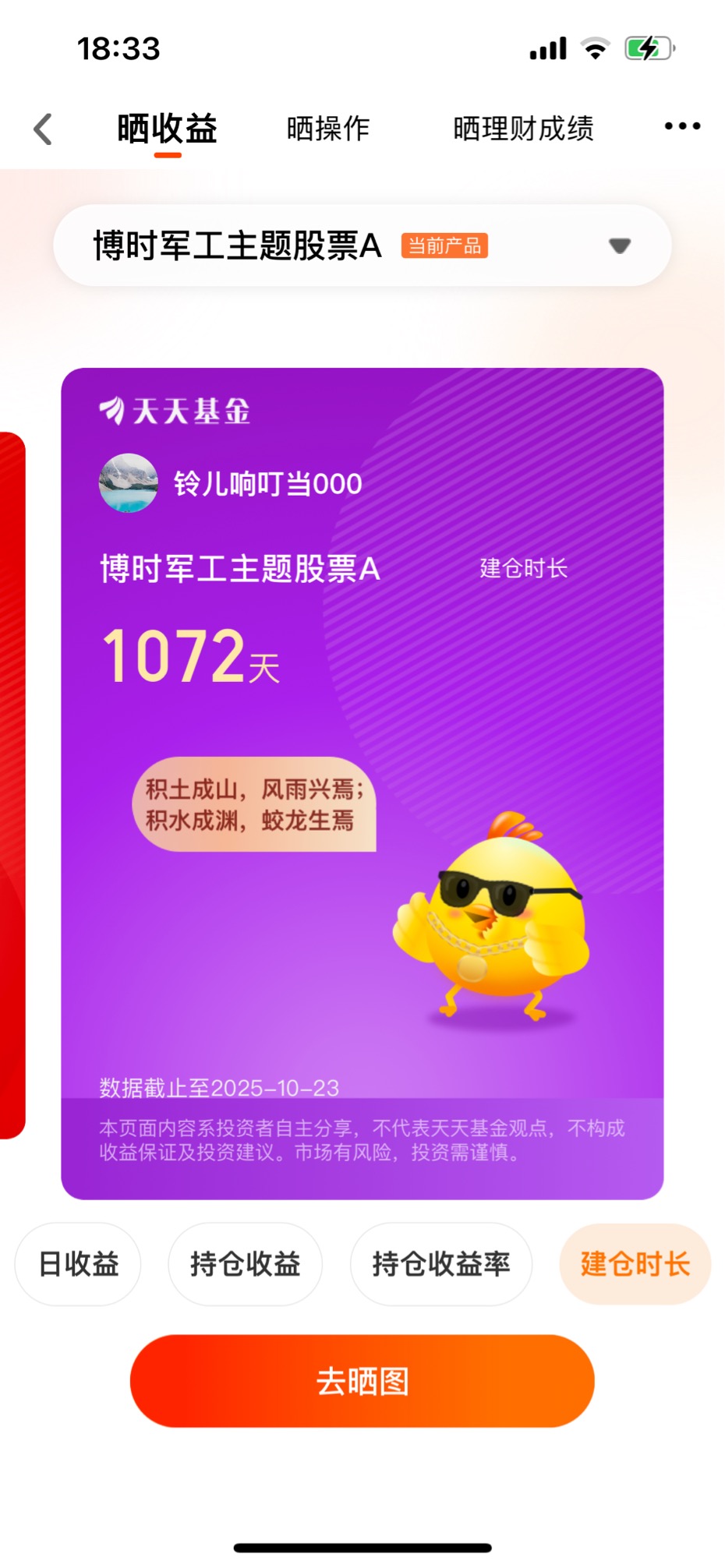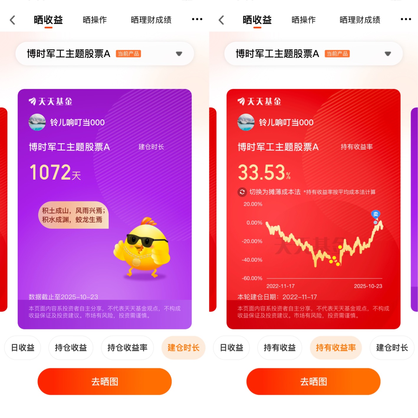 说完了“盾”,咱们再来聊聊“进攻的矛”。要想让资产真正增长,光守着可不行,还得有“进攻”的武器。我的第一个矛选手是博时军工主题股票A基金,这个我拿的时间更长,1072天!差不多快三年了。它的持有收益率是33.53%,这个成绩我还是很满意的。