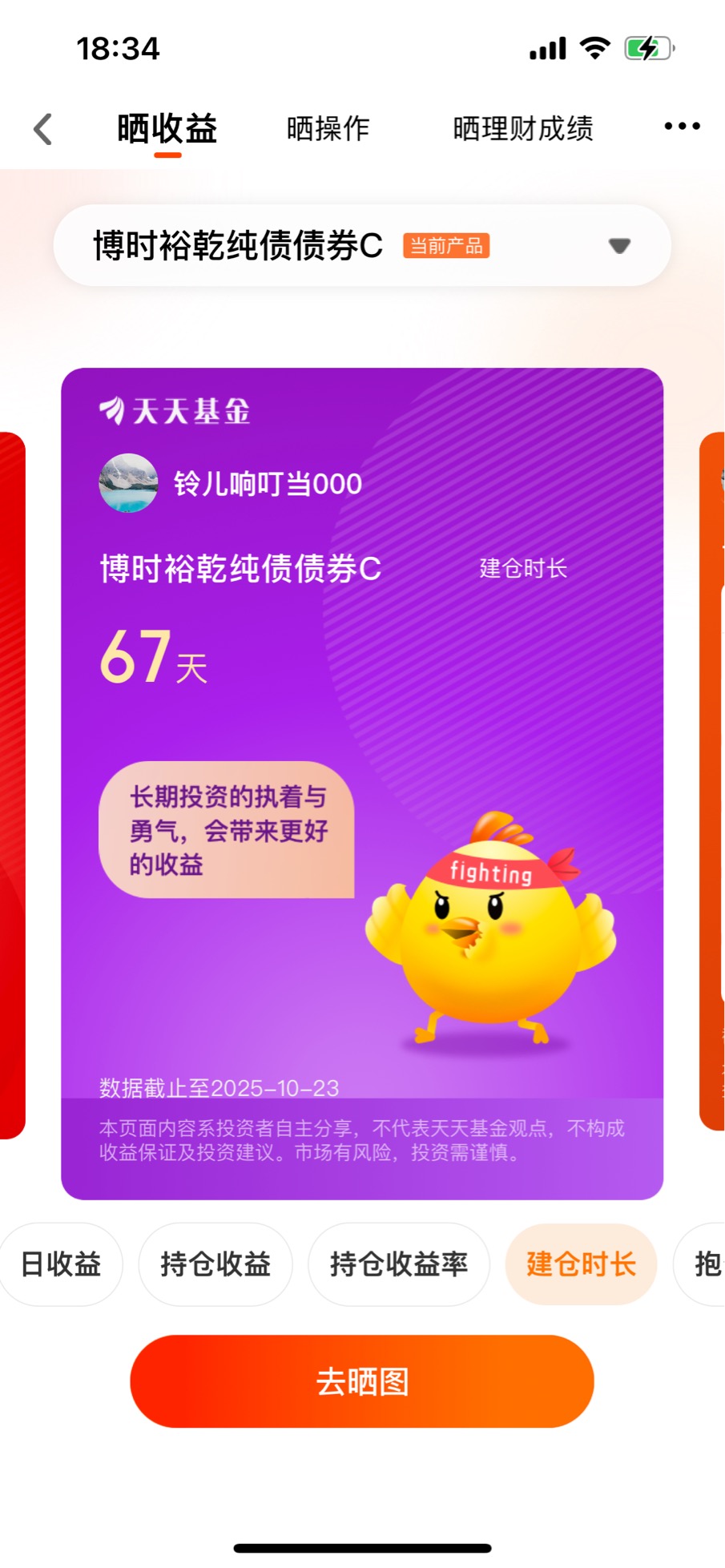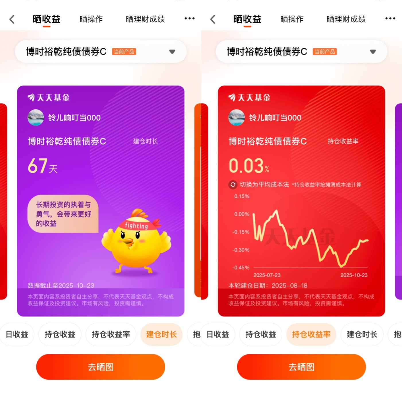 我的第二个盾牌选手是博时裕乾纯债债券C基金,这个是我刚拿没多久,才67天。收益率虽然不高,只有0.03%,但债券基金嘛,追求的就是一个稳。你看它的收益曲线,虽然也有波动,但整体是比较平稳的。在当前的市场环境下,纯债基金就像一个稳重的老朋友,不会大起大落,能帮我守住基本盘。有时候看着那些高风险投资的大起大落,再看看我这纯债基金的小波动,就觉得特别安心,它就是我投资组合里的“定海神针”。