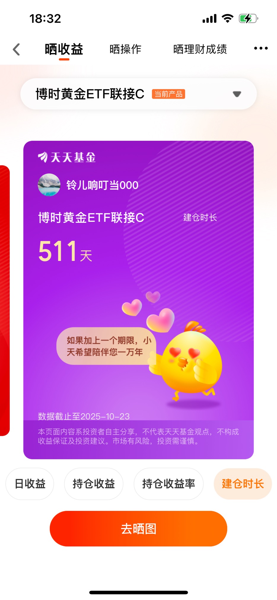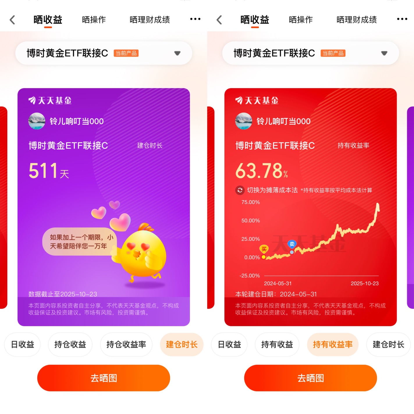 先说说我这“防御的盾”吧,毕竟市场风云变幻,手里有个“盾”心里就踏实多了。我的第一个盾牌选手是博时黄金ETF联接C基金。你们猜我拿了多久?整整511天!这日子可不短了,从最开始的试探到现在的坚定持有,它给我的回报那叫一个亮眼——持有收益率63.78%!是不是很惊喜?