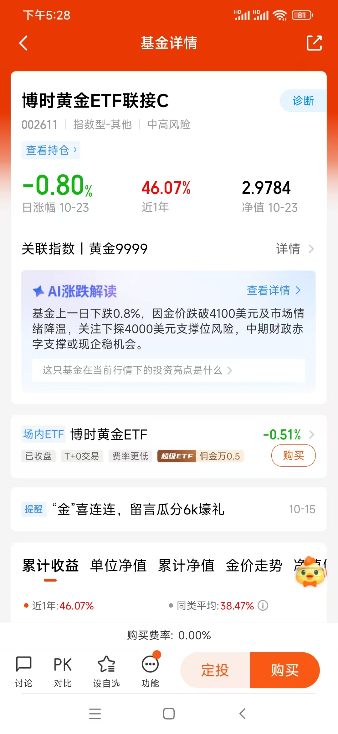 另外,博时黄金ETF联接C有一个好处,就是持有满30天可以免赎回费,这给了我很大的灵活性。如果以后有更大的价格调整,我可以随时做出调整应对。所以,黄金在我眼里算是一种“保险”了,我会继续持有,长期看好它的表现。